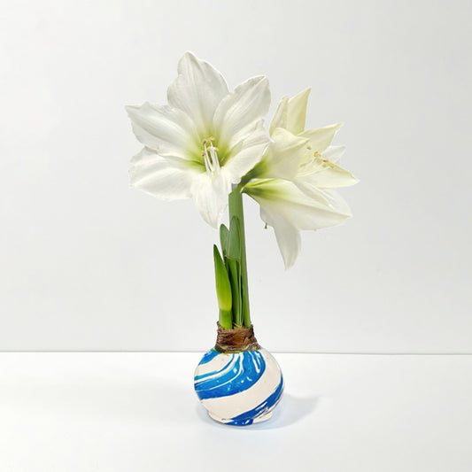Bowl of White Alfresco Blooms with planted amaryllis bulbs
