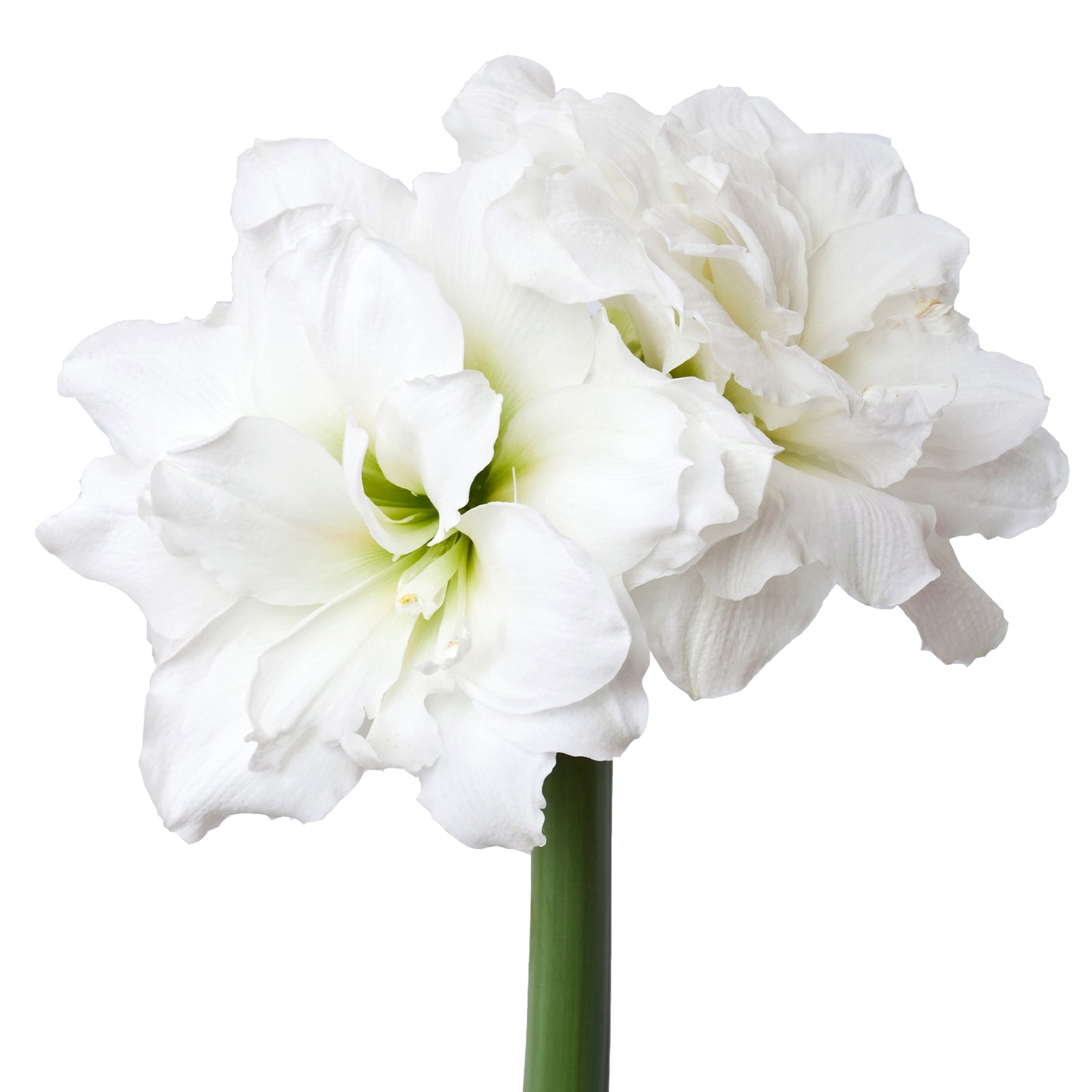 The Alfresco Amaryllis bulbs are a favorite for a good reason; they produce beautiful, double (and sometimes triple) blooms that grow 6+ inches across, presenting full-petaled white flowers with chartreuse centers. Around 6-8 weeks after planting, each bulb produces 2-3 stems with 5-8 flowers each. Easily plant one of the bulbs in your favorite bowl or pot with well-draining soil and watch with wonder as the flowers emerge.