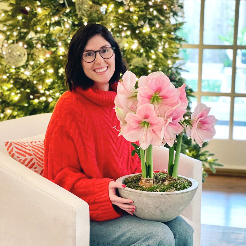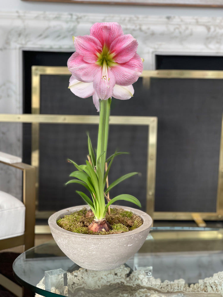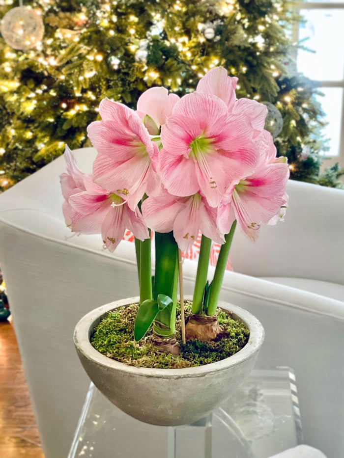 Beautiful, Blushing Pink Amaryllis bulbs from South Africa planted in a small resin container that can be replanted season after season with your favorite flowers. Your Bowl of Pink Blooms comes planted with three 28-32” bulbs that will produce multiple stems and an abundance of flowers. Pink symbolizes love, nurture, and compassion and the amaryllis are believed to mean pride, strength, and determination. This bowl of Pink Amaryllis is a beautiful, meaningful addition to any home.