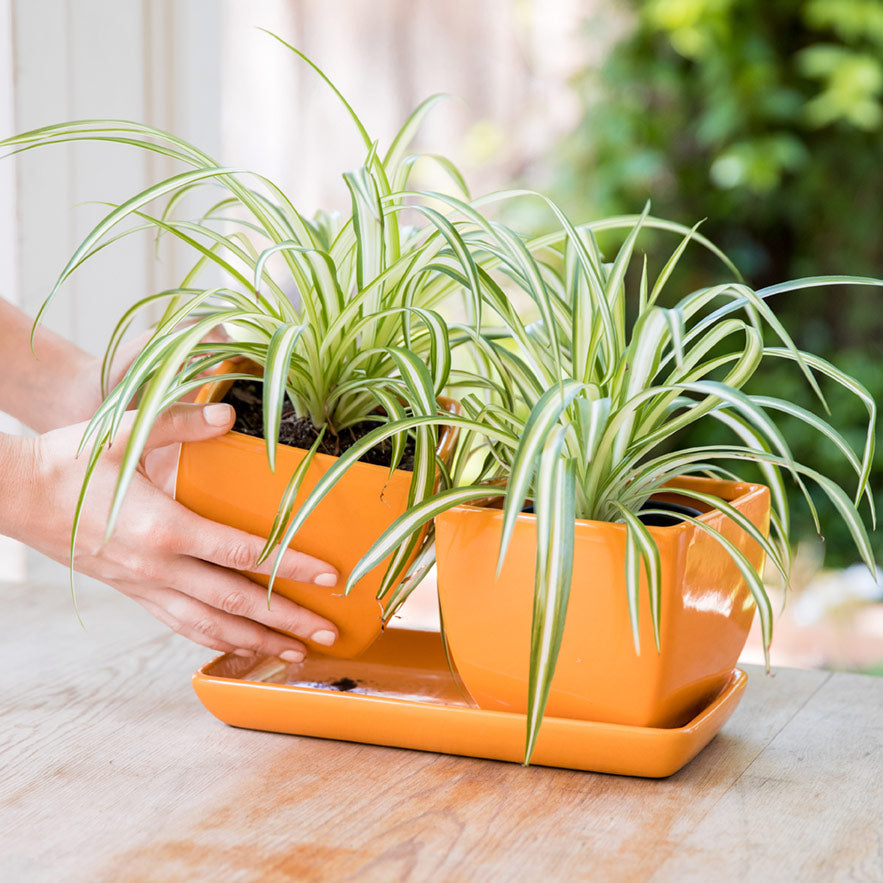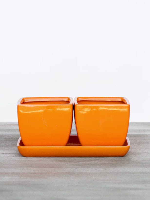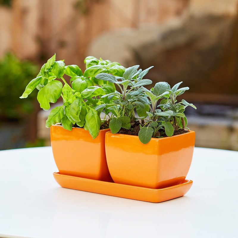 A stunning set of glazed terracotta planters that move from season to season with ease. Brighten up your kitchen, tabletop, or outdoor patio with our limited edition Double Duty Orange Planter. This versatile set works indoors or out! It is weather-resistant and can easily be wiped clean with a damp cloth.