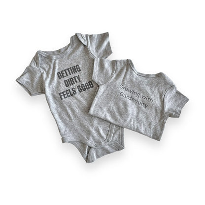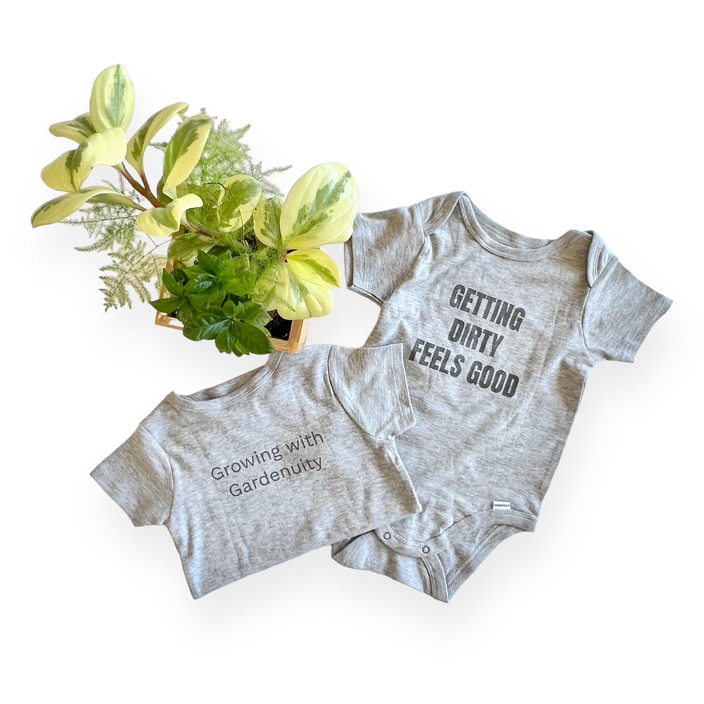 Getting dirty feels good, and so does growing with Gardenuity! Our custom short sleeve onesies with expandable lap shoulder necklines and bottom snaps are perfect for layering. Made of Gerber’s 100% cotton interlock fabric, your little one can be comfortable while getting a little dirty.