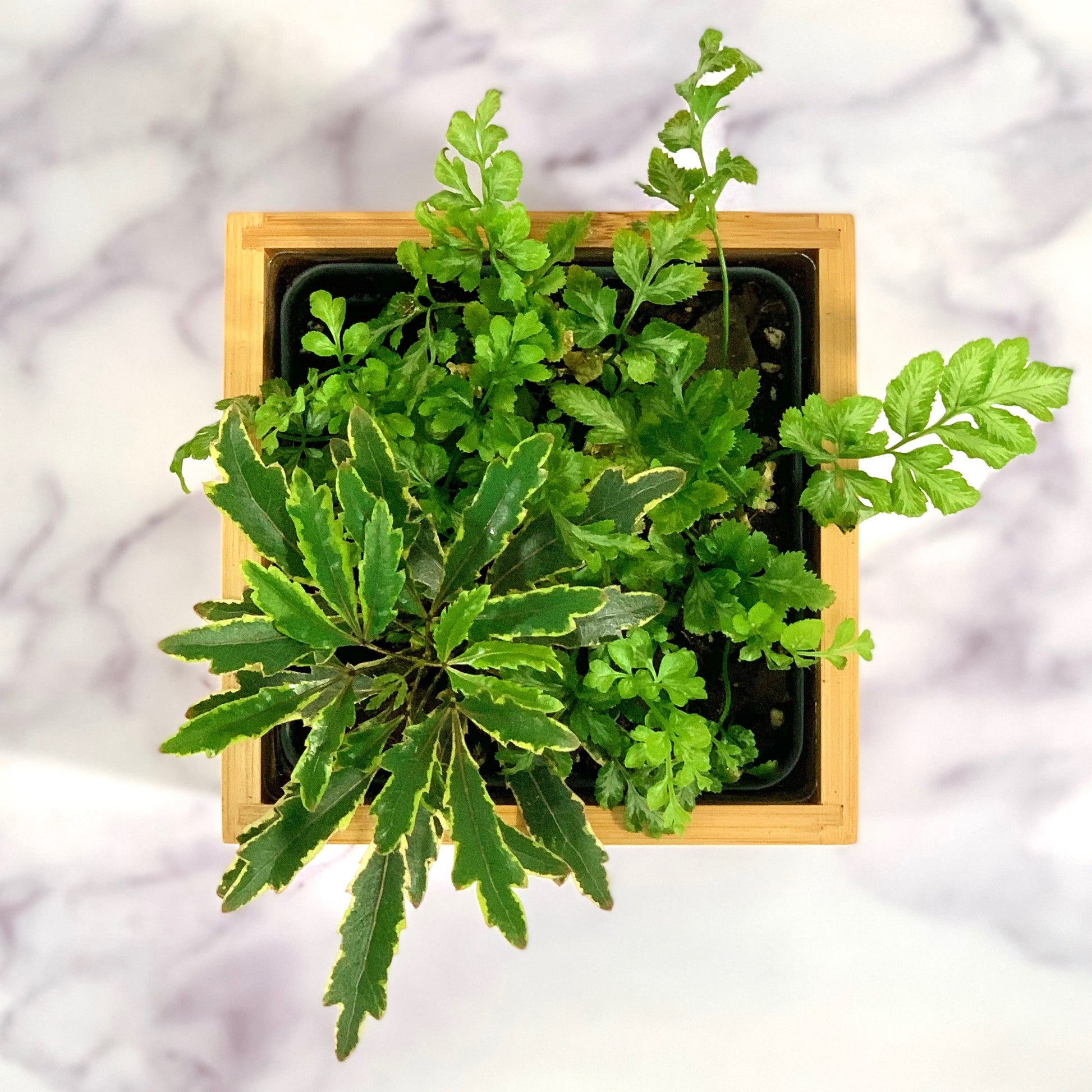Whether you prefer a more natural or industrial aesthetic, this Tropical Desktop Garden is a lovely addition to any indoor space! Each kit includes a collection of tropical plants that will grow beautifully together, and each plant is unique in its coloring and variegation. This indoor garden works in low light, making it an ideal way to add some foliage to any home or office.