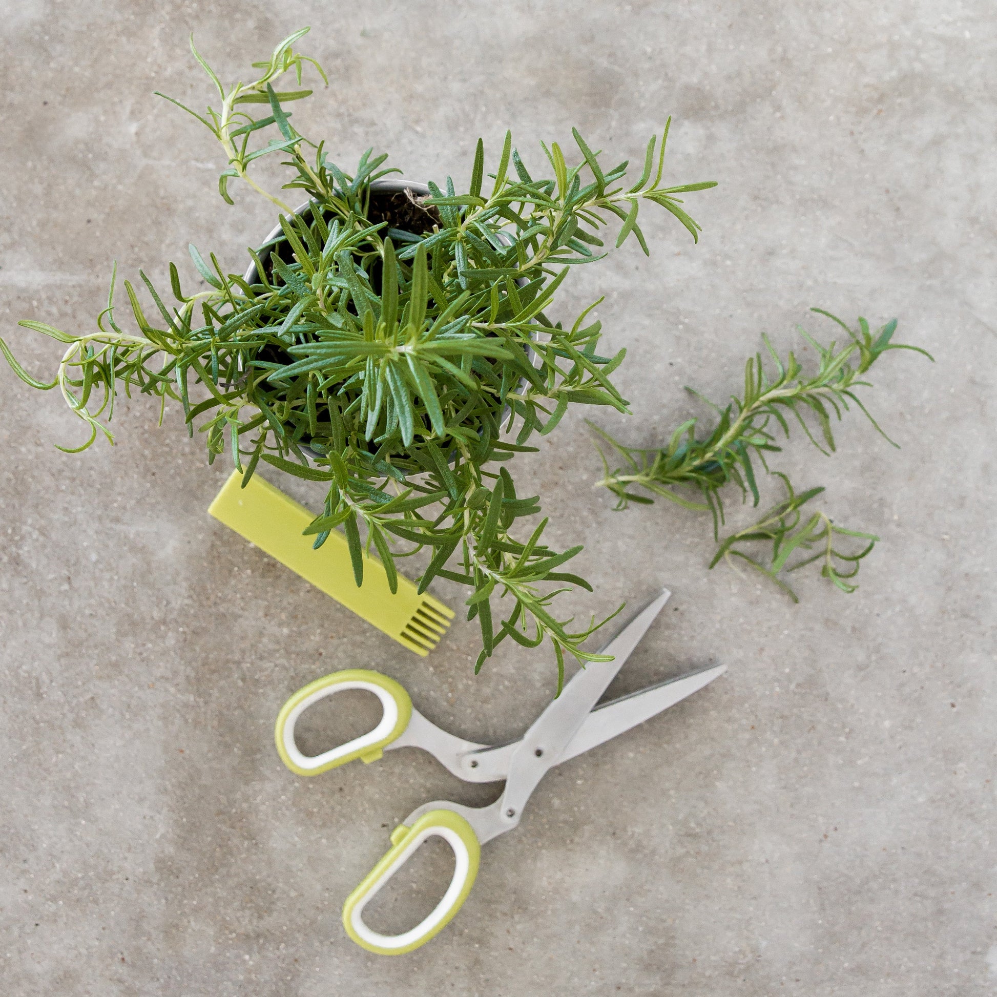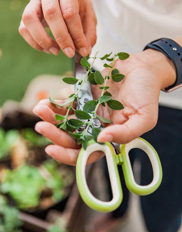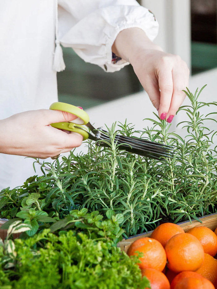 Large plastic handles have a soft silicone lining for a comfortable grip. The blade cover provides safe storage for the mincing scissors when not in use and doubles as a helpful cleaning tool. Simply insert the notched end of the cover between the blades and push any remaining herbs off the scissors.