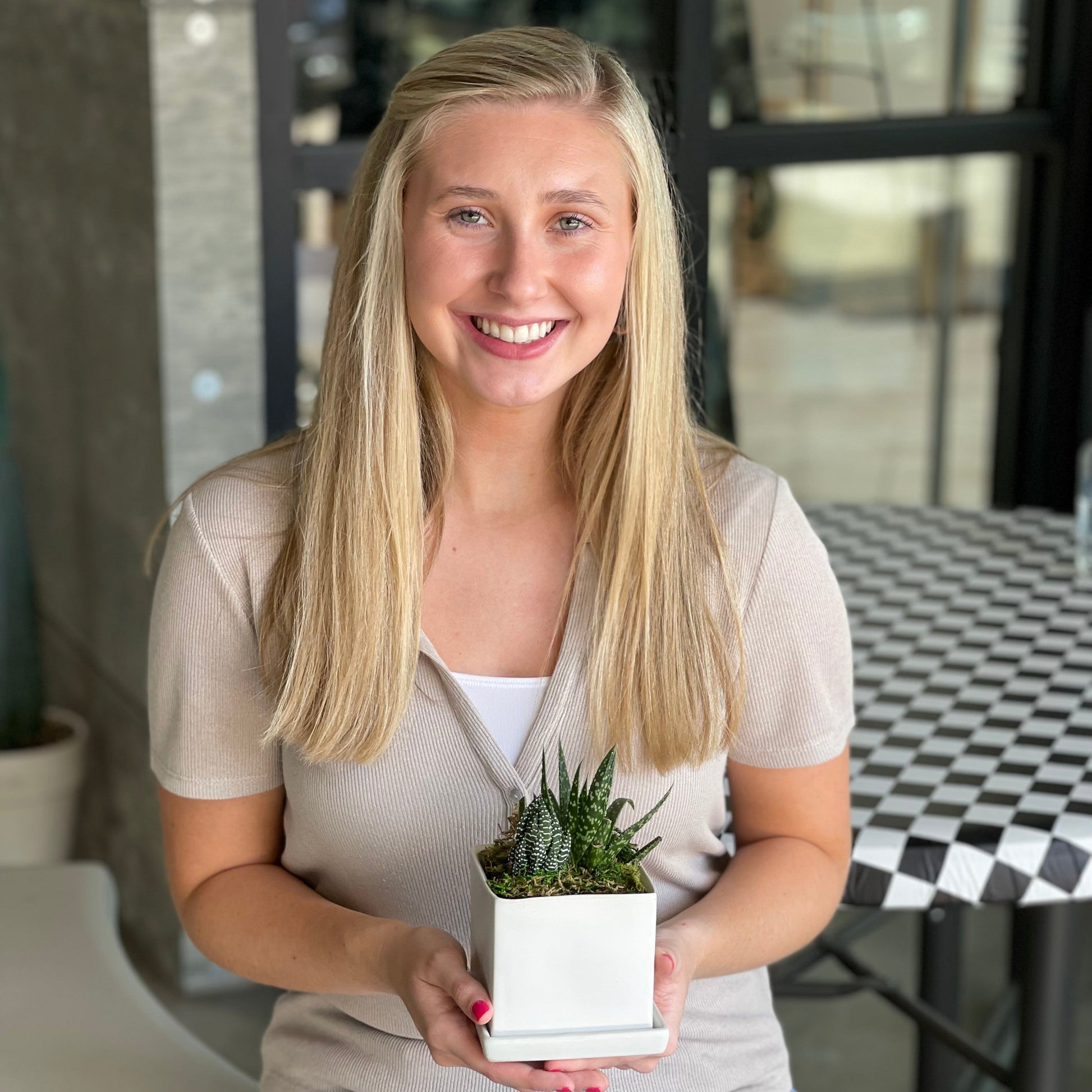Mini White Ceramic Planter – A reusable, ceramic planter that includes a plant liner and mini tray. The planter is approx. 3.75"L x 3.75"W x 3.5"H. The drip tray is approx. 4.25"L x 4.25"W x 0.5"H.