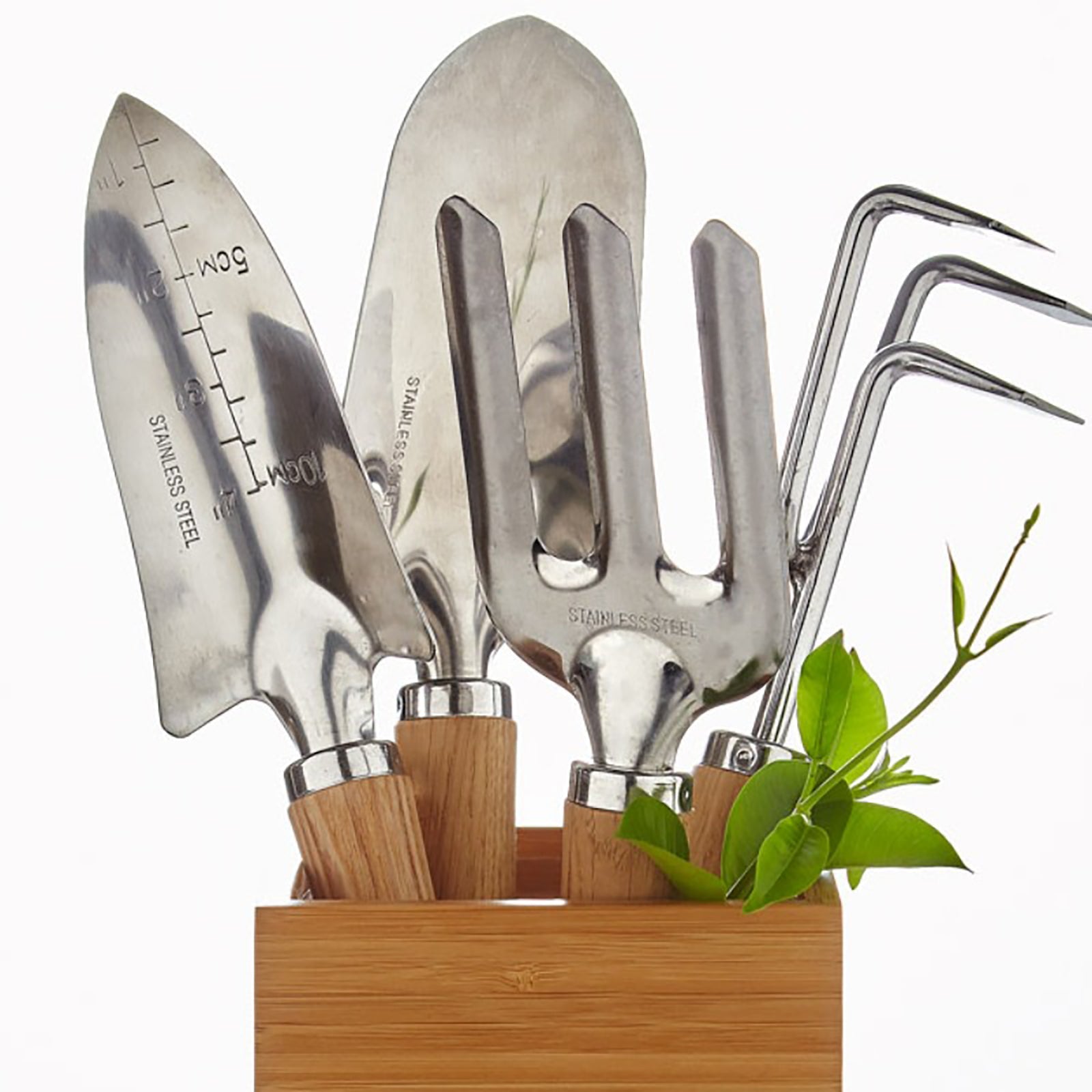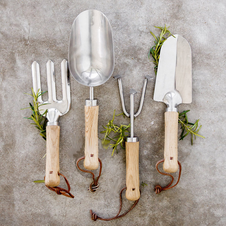 Our Patio to Table Garden Tool Set includes four essential gardening tools: a hand trowel, hand fork, hand transplanter, and hand cultivator. Each of these tools is made of high quality stainless steel with an ash wood handle. This tool set is a Gardenuity exclusive and a Grow Pro team favorite. These four classic gardening tools add ease to your growing experience so you can continue harvesting all season long!