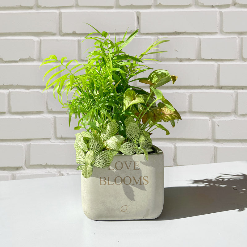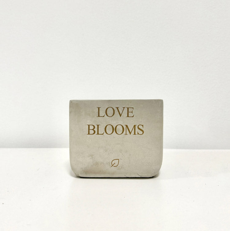 Concrete planter engraved with “Love Blooms” (approx. 5 x 5 x 5 inches)
