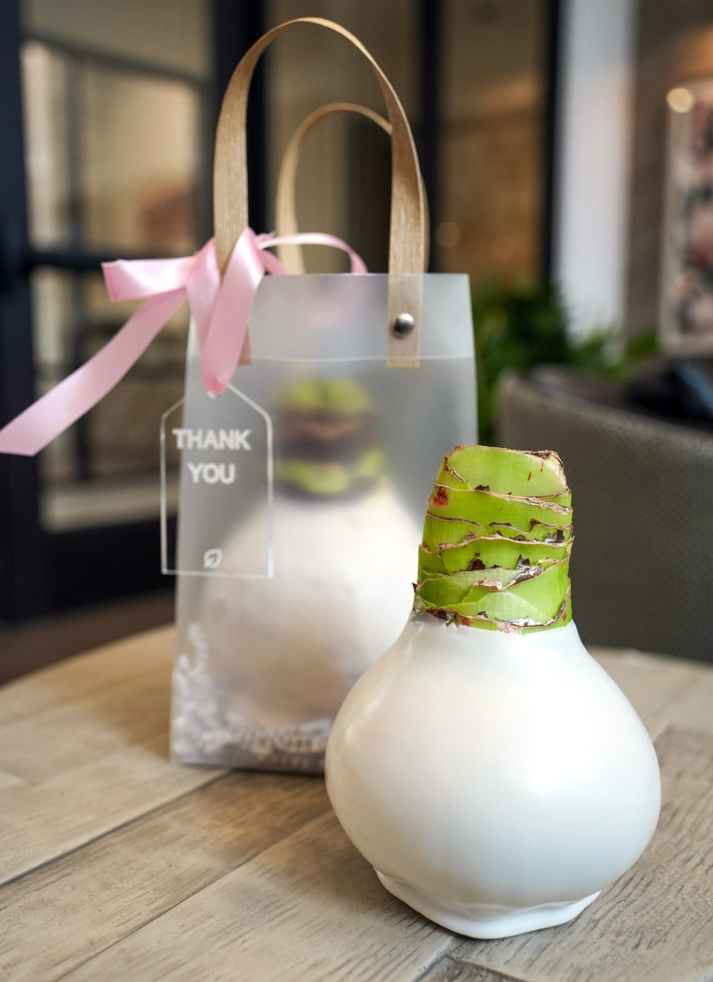 2 White Waxed Amaryllis ‘Apple Blossom’ Bulbs, 1 Gift Bag with crinkle paper, 1 ‘Thank You’ Acrylic Gift Tag tied with pink ribbon, 2 Bulb Care Cards, $25 Donation to Susan G. Komen, 1 (Optional) Hand-Written Gift Note