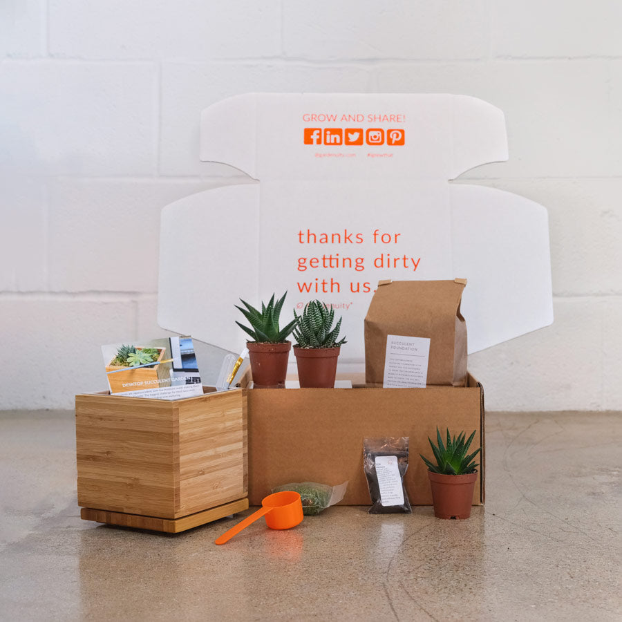 Your Succulent Desktop Garden comes as a kit with step-by-step instructions and everything you need to care for your plants. As you build your indoor garden, enjoy getting a little dirty in the soil! Everything in the desktop garden kit is designed with you in mind and customized to the needs of your plants.